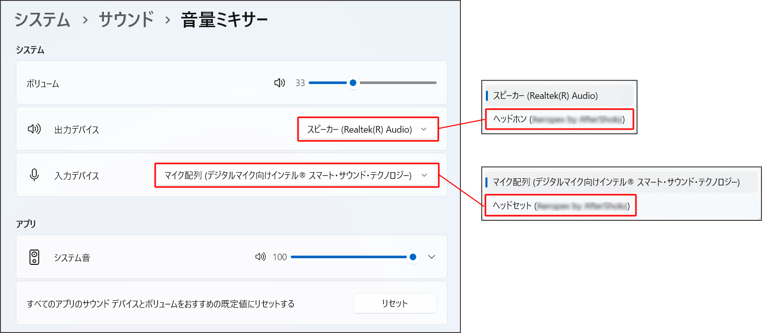 「出力デバイス」および「入力デバイス」の「v」をクリックし、プルダウンメニューを表示します。