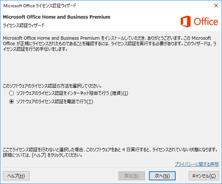 Office初回セットアップ時のライセンス認証の際に「ソフトウェアのライセンス認証を電話で行う」を選択し、「次へ」をクリックすると(画面1)、「電話によるライセンス認証手続きは、この製品ではサポートされていません」というエラーメッセージが表示され、電話番号が表示されない(画面2)。
