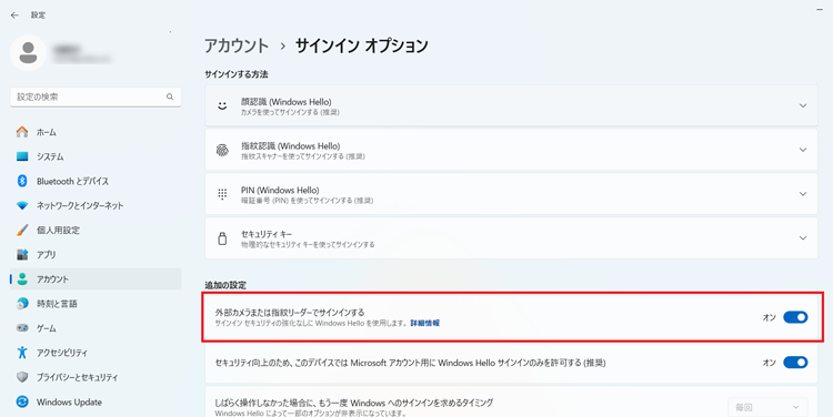 - 「追加の設定」の「外部カメラまたは指紋リーダーでサインインする」をクリックして「オン」にします。