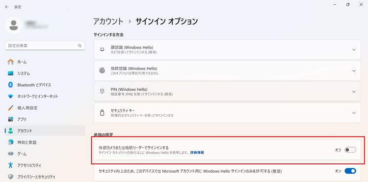 - 「追加の設定」の「外部カメラまたは指紋リーダーでサインインする」をクリックして「オフ」にします。