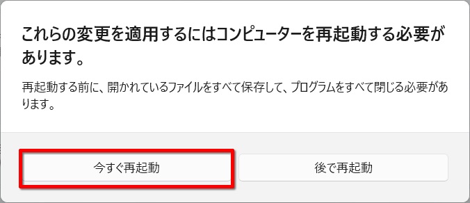 - 画面のメッセージに従い「今すぐ再起動」をクリックします。