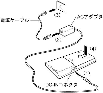 次の図のように、(1)添付のACアダプタをバッテリチャージャーに接続したあと、(2)電源ケーブルの片方をACアダプタに接続し、(3)もう片方をコンセントに接続し、(4)バッテリパックをバッテリチャージャーにセットします。