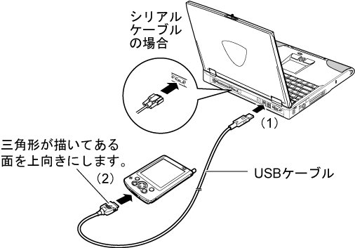 次の図のように、(1)添付のUSBケーブルまたは別売のシリアルケーブルの片方をパソコンのコネクタに接続し、(2)もう片方をクレードルに接続したあと、(3)本製品をクレードルにセットします。