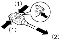 (1)コネクタ両端のボタンを押しながら、(2)取り外します。