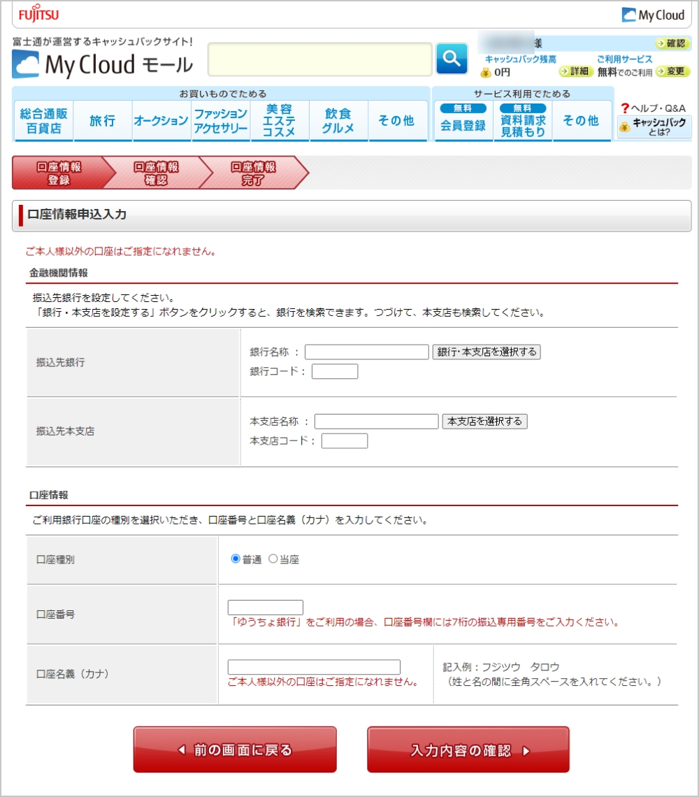 My Cloudアカウント登録名と同一のお申込者ご本人名義の口座に限ります。