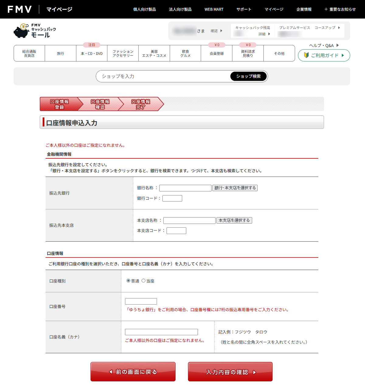 WEBサイト上にてキャッシュバックのお振り込み用口座を登録してください。