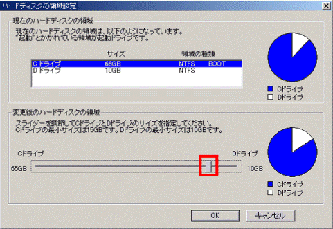 「変更後のハードディスクの領域」のつまみを左クリックしたまま左右に移動させ、C ドライブとD ドライブの領域(サイズ)を設定します。