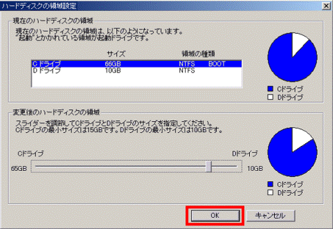 - C ドライブとD ドライブの領域(サイズ)の設定ができたら、「OK」ボタンをクリックします。
