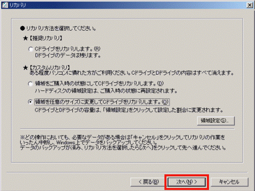 そのため、領域(サイズ)を設定したあとに、リカバリを行う必要があります。 - データのバックアップが必要な場合は、領域(サイズ)の設定を行う前に次のQ&A をご覧になり、外部メディア(CDやDVD)などにデータをバックアップしてくだい。