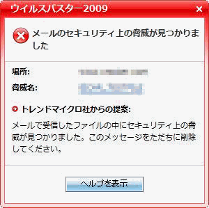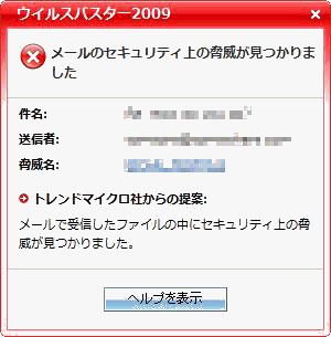 [ウイルスバスター2009] 赤色の枠で「メールのセキュリティ上の脅威が見つかりました」と表示されます。