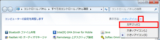 「表示方法」の右側にある「▼」ボタンをクリックし、表示されるメニューから「カテゴリ」をクリックして、表示方法を変更してください。