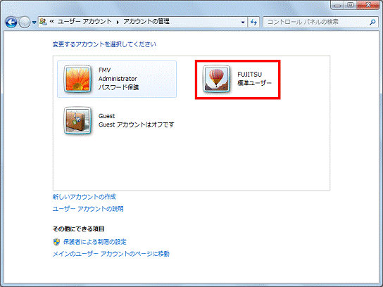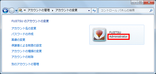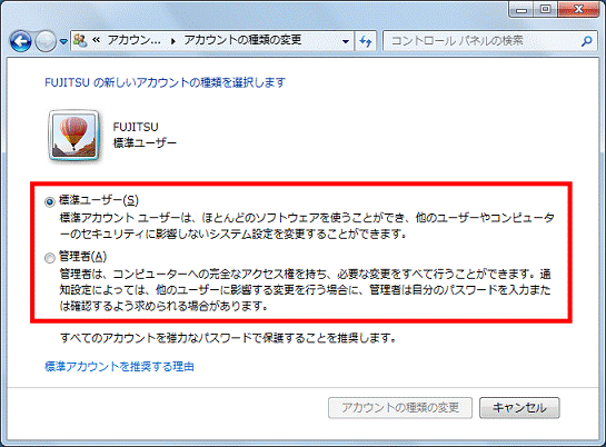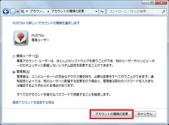 - 「管理者(Administrator)」のアカウントが1つしかない場合は、そのユーザーアカウントを「標準ユーザー」に変更することはできません。