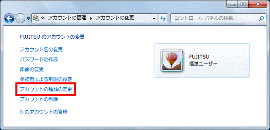 Windows 7で、アカウントの種類を変更する方法を教えてください。
