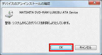 CD/DVDドライブの名称は、お使いの機種によって異なります。 - 「デバイスのアンインストールの確認」が表示されます。