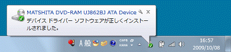 再起動後、画面右下の通知領域に「デバイス ドライバー ソフトウェアが正しくインストールされました。」と表示された場合は、「×」をクリックして閉じてください。