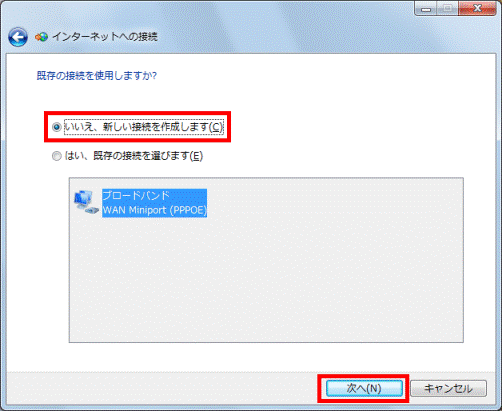 「既存の接続を使用しますか?」と表示された場合は、「いいえ、新しい接続を作成します」をクリックし、「次へ」ボタンをクリックしてください。