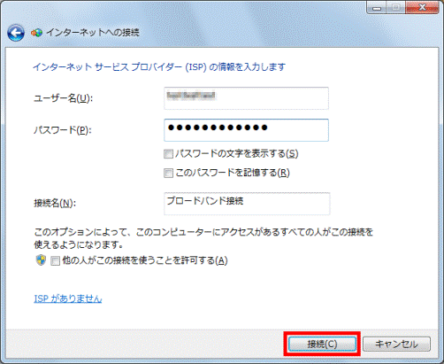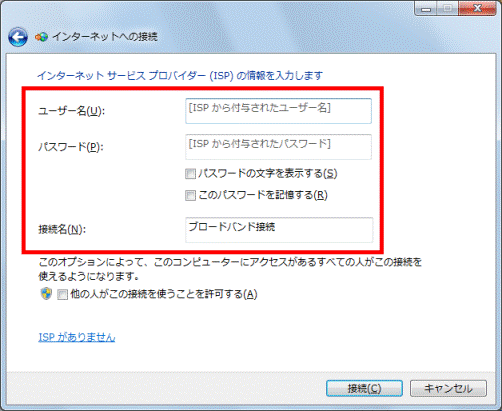 - 「インターネットサービスプロバイダー(ISP)の情報を入力します」と表示されます。