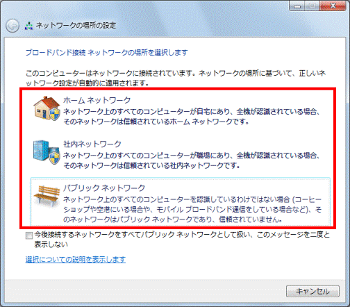 - 「(接続名)ネットワークの場所を選択します」と表示されます。