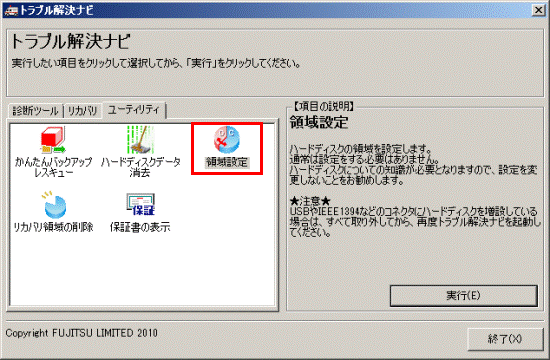 CドライブとDドライブの割合を変更するには、トラブル解決ナビから領域設定を実行します。