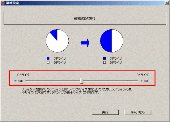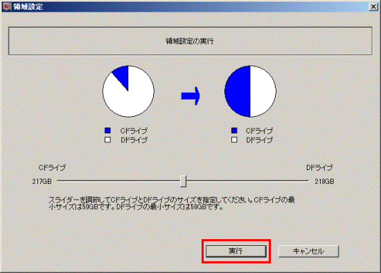 つまみを右に動かすと、Cドライブの領域(サイズ)が大きく、Dドライブの領域(サイズ)が小さくなります。 - 割り当てる領域(サイズ)を設定できたら、「実行」ボタンをクリックします。