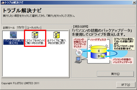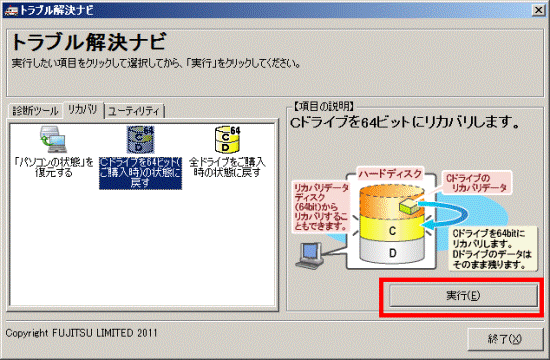- 「Cドライブを64ビット(ご購入時)の状態に戻す」アイコン、または「Cドライブを32ビット(ご購入時)の状態に戻す」アイコンをクリックします。