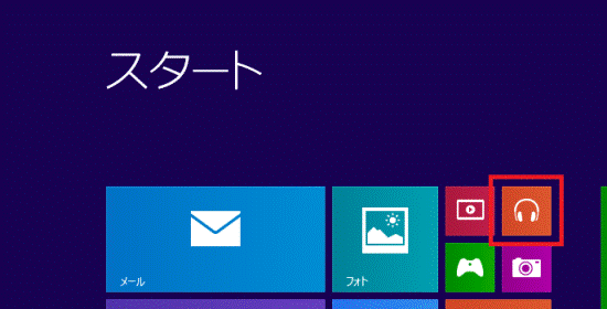 デスクトップの場合は、画面の右下にマウスポインターを移動し、チャームが表示されたら「スタート」をクリックします。 - ミュージックが起動します。