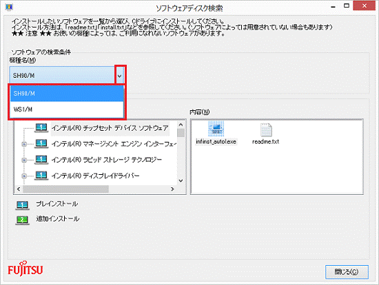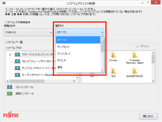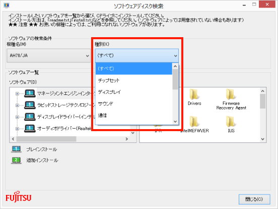 アドバイス「種別」が選択できる場合、「種別」を選択すると、インストールするアプリケーションやドライバーを種別で絞り込んで表示できます。
