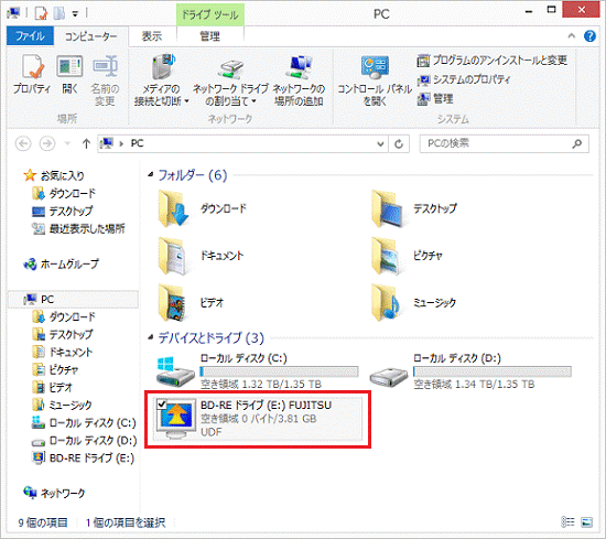 - CD/DVD/BDドライブのアイコンをダブルクリックします。