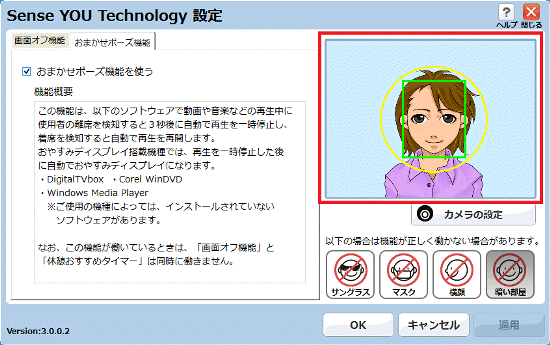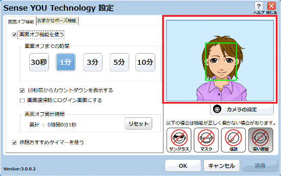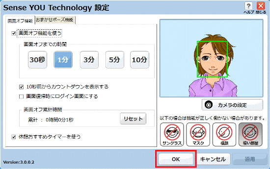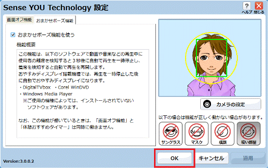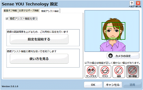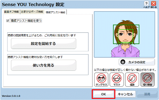 緑色の枠が表示されない場合は、マスクやサングラスを取る、顔を近づける、部屋を明るくするなど、緑色の枠が表示されるように調整してください。 - 「OK」ボタンをクリックし、「Sense YOU Technology 設定」を閉じます。