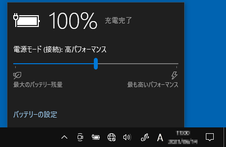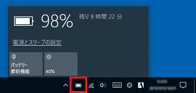 バッテリの残量は、デスクトップ画面右下の通知領域にある、電源アイコンで確認できます。