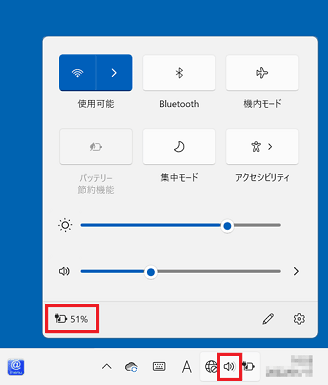 バッテリの残量は、タスクバーの右側にある「スピーカー」アイコンをクリックします。