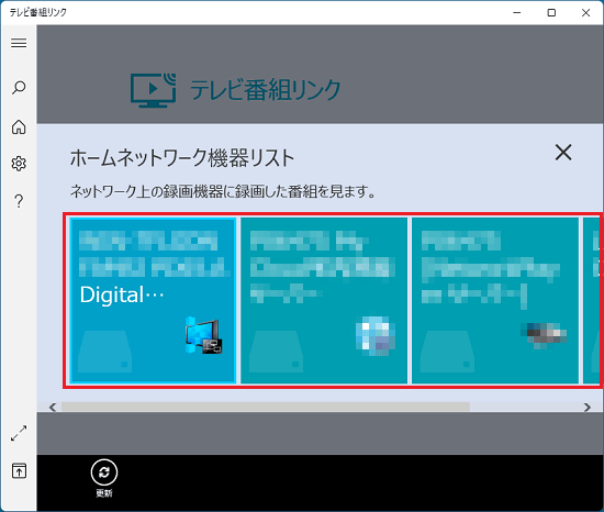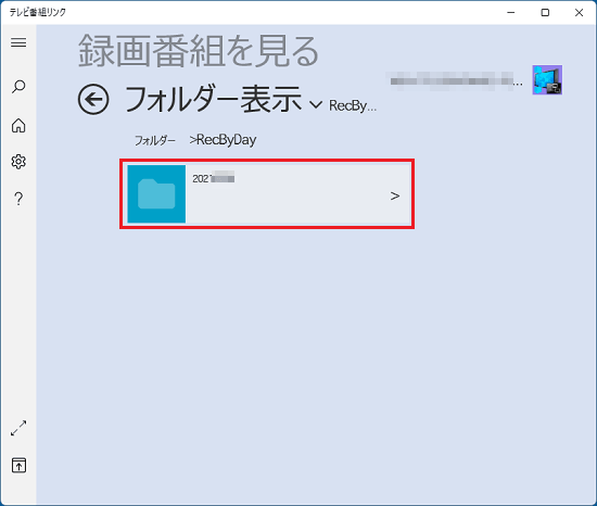 「更新」ボタンを押してからしばらくしても目的のメディアサーバーが表示されない場合は、各メディアサーバーのネットワーク接続設定を確認してください。 - メディアサーバーに接続すると、「録画番組を見る」に切り替わり、メディアサーバー内のフォルダーが表示されます。