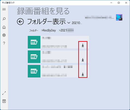 テレビ番組リンクのホーム画面にある、「録画番組を見る」からメディアサーバーを選択し、目的の番組にチェックを付けてダビング(ダウンロード)します。