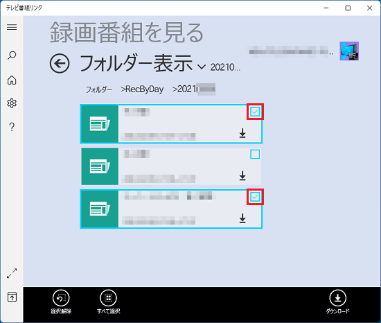 - ダビングしたい録画番組のタイルの上に、マウスポインターを合わせて表示される四角形をクリックして、チェックを付けます。
