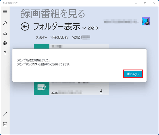 パソコン側では操作を行わず、メディアサーバー側のリモコン操作で録画番組をダビングします。