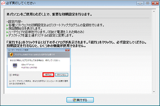 Windows 7 / Windows Vistaがプレインストールされている機種で「必ず実行してください」をクリックし、画面の操作にしたがって操作を行うと、「ユーザーアカウント制御」が表示されることがあります。