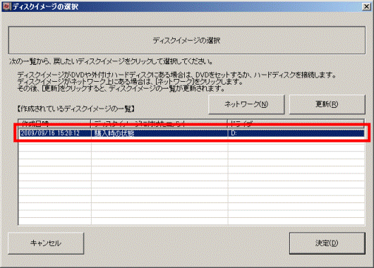「【作成されているディスクイメージの一覧】」から、戻したいディスクイメージをクリックします。