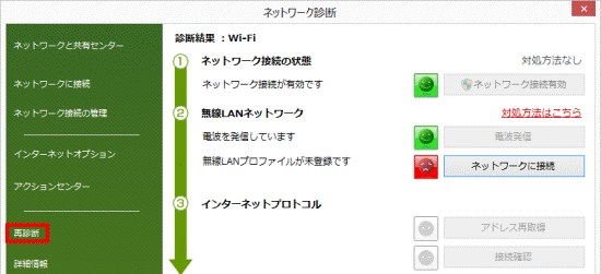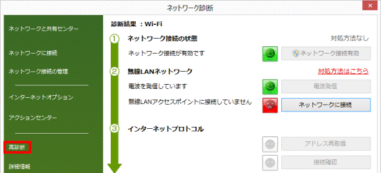 対処後に、「ネットワーク診断」の画面左にある「再診断」をクリックし、もう一度診断結果を確認します。