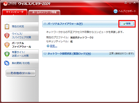 なお、ウイルスバスター2009をインストールした直後の状態では、パーソナルファイアウォール機能は有効に設定されています。