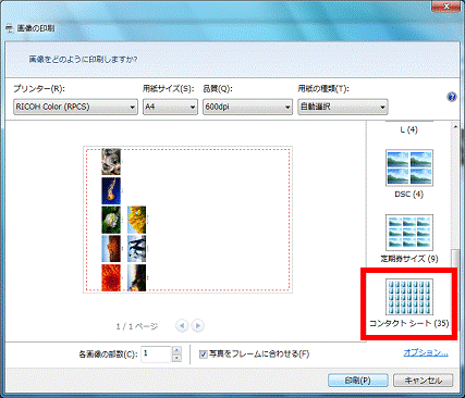「画像の印刷」の用紙の種類で「コンタクトシート」を選択すると、A4用紙だと1枚に最大35枚の写真を印刷できます。