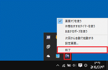 Windows 8.1、またはWindows 8で、スタート画面が表示されている場合は、「デスクトップ」タイルをクリックしてから、手順1.を操作します。 - 「Sense YOU Technology 設定」アイコンを右クリックし、表示されるメニューから「終了」をクリックします。