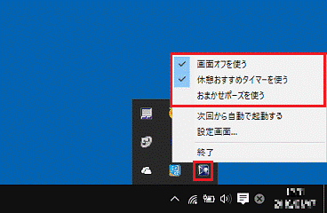 Windows 8.1、またはWindows 8で、スタート画面が表示されている場合は、「デスクトップ」タイルをクリックしてから、手順1.を操作します。 - 「Sense YOU Technology 設定」アイコンを右クリックし、メニューが表示されたら、「次回から自動で起動する」にチェックが付いているかどうかを確認します。