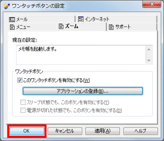 チェックがないタブがあった場合は、「このワンタッチボタンを有効にする」をクリックし、チェックを付けます。 - すべてのタブの確認が終わったら、「OK」ボタンをクリックします。