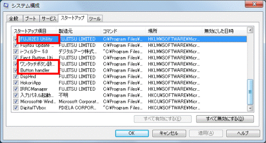 常駐アプリケーションの起動の有無は、「システム構成」(「システム構成ユーティリティ」/「システム設定ユーティリティ」)の「スタートアップ」タブで確認できます。