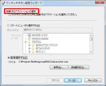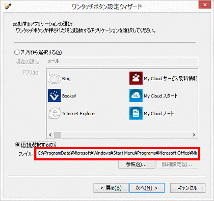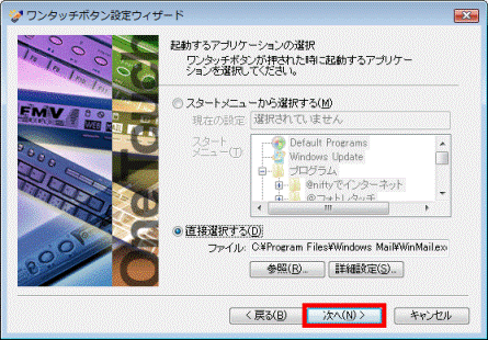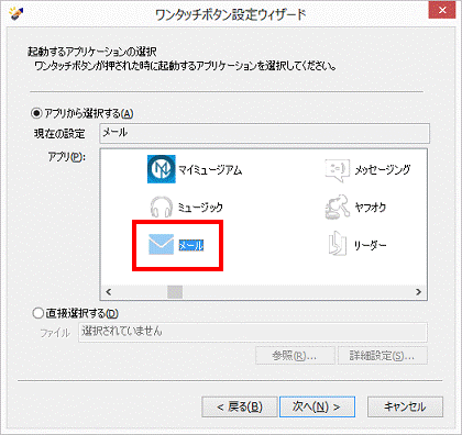 (「メール」を起動する場合)アドバイス「直接選択する」が選択されている場合は、「ファイル」に表示されているプログラムを確認し、次の手順に進みます。