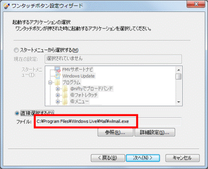 (「Windows Live メール」を起動する場合)アドバイス「直接選択する」が選択されている場合は、「ファイル」に表示されているプログラムを確認し、次の手順に進みます。