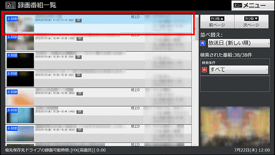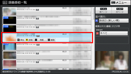 放送日(新しい順) / 放送日(古い順) / タイトル(昇順) / タイトル(降順) - 「赤」ボタンを押すと、番組のジャンル(ニュース/報道、スポーツなど)や、状態(おまかせ予約、保護、未視聴など)から検索できます。