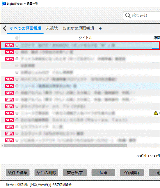 保護されている番組のチェックボックスをクリックしてチェックを付け、画面下側にある「保護解除」ボタンをクリックします。
