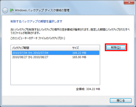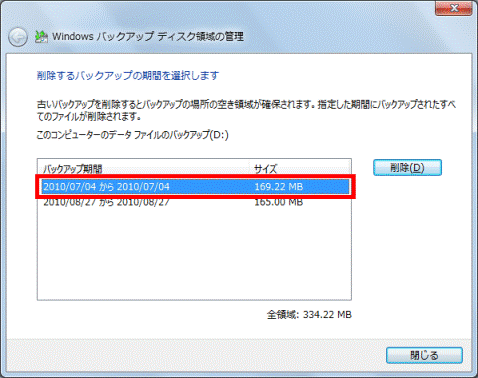 「バックアップ期間」の一覧から、削除するバックアップデータをクリックします。