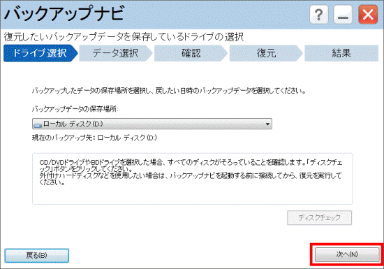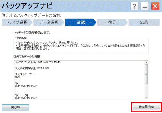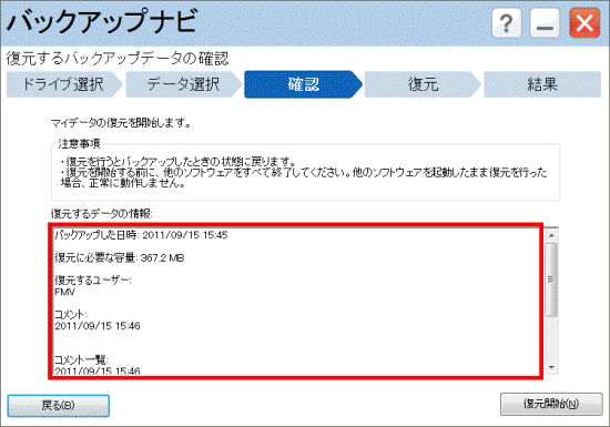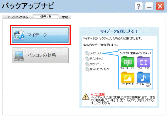 本当に戻してよいかどうか、よく確認してから復元してください。 - 外付けハードディスクなどにバックアップしたマイデータから復元するときは、バックアップナビを起動する前に接続してください。